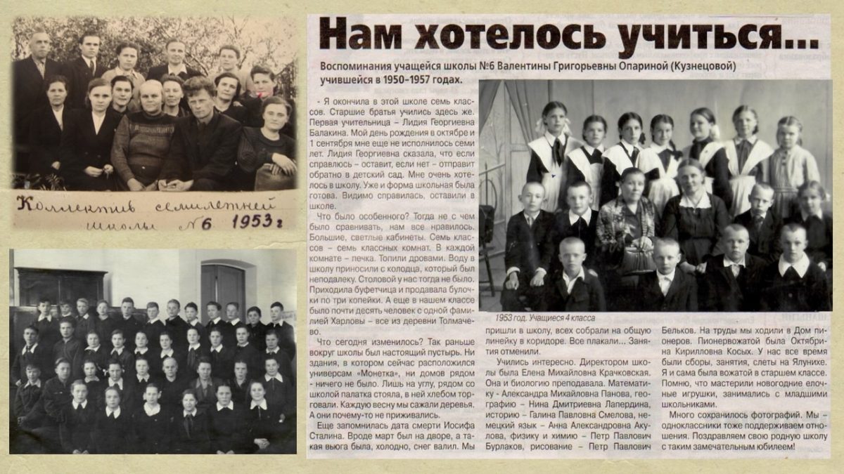 Школа № 6 в период с 1951 по 1958 год была семилетней. Старшеклассники, с увлечением занимавшиеся садоводством и огородничеством под руководством Савина И.М., высадили саженцы яблонь и кусты смородины на школьном огороде и сквере около школы. В шестидесятые годы под руководством учителя биологии Крачковской Е.М. (директор школы 1951-1958 гг.) ученики школы заложили большой сад.